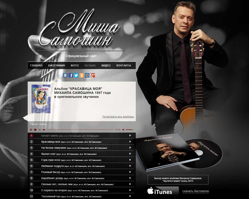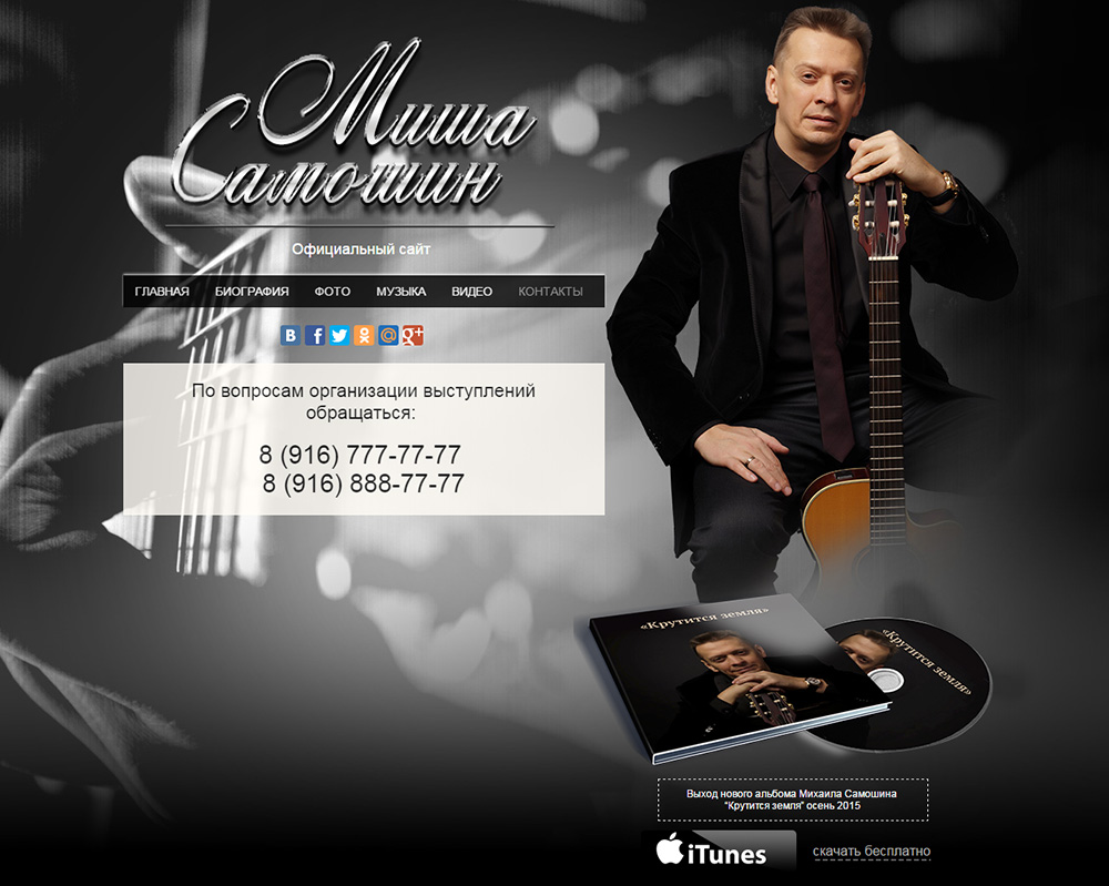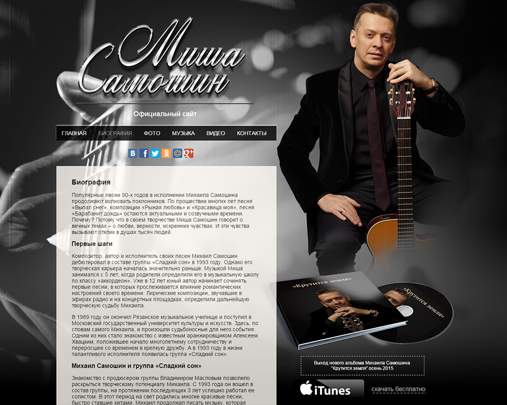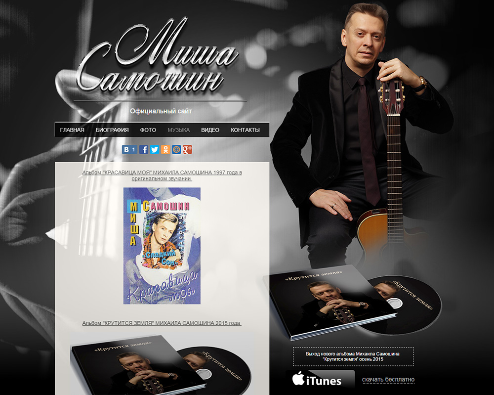 Сайт, посвященный творчеству музыканта Миши Самошина, создан в 2014 году. Он разработан, как место встреч поклонников артиста с его знакомыми и новыми композициями, а также как источник достоверной информации о работах музыканта, его творческой биографии. Главная страница сайта сразу погружает его посетителей в мир музыки Михаила Самошина. Дизайн проекта стильный и лаконичный, отвечает утонченному имиджу артиста. Простая и компактная структура сайта позволяет ознакомиться со всей интересующей информацией: биографией музыканта, его студийными и семейными фото, популярными клипами. В открытом доступе представлены альбомы исполнителя. В настоящее время ведется подготовка к началу работ по оптимизации сайта.